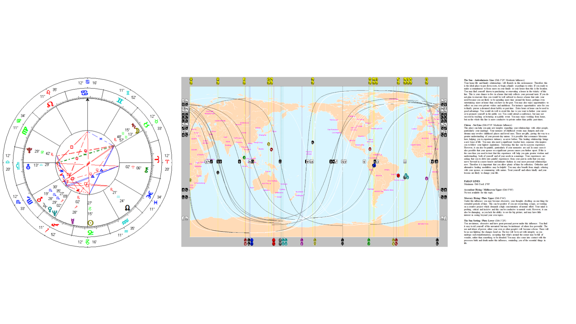 ASTROCARTOGRAPHY is three dimensional astrology taking into account time, space and relationship revealing that we are not just tied to a specific location or dimension based on our birth chart; we can exist in multiple places at once, experiencing different energies and influences in different parts of the world. our natal chart, which consists of the positions of the planets at the time of our birth, is a reflection of our personality, challenges and opportunities. by mapping the planetary lines over the globe, we can see where the energies of those planets are most concentrated, revealing where we might thrive and where we might face more intense challenges.
